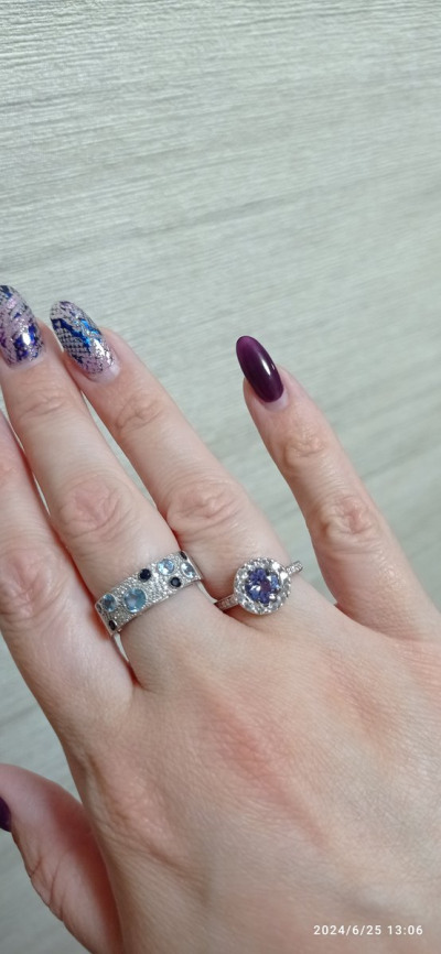 Очень красивое, эстетичное кольцо, размер соответствует, у меня 16.5,сапфиры не очень горят, но дизайн супер, танзанит искрится.