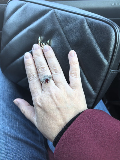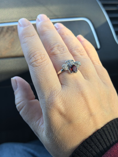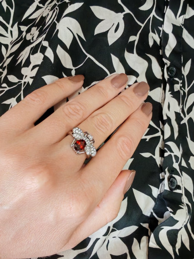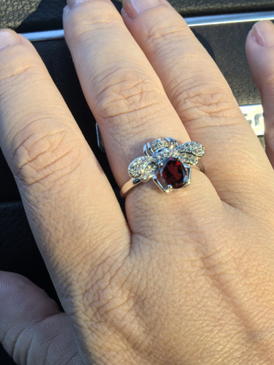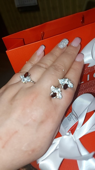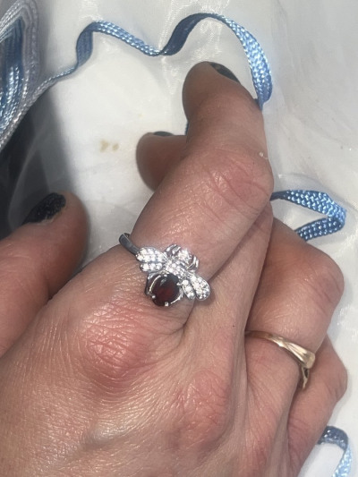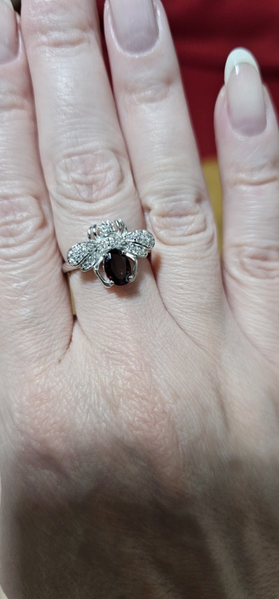 Колечко сразу же было отправлено в корзину. Прямо оно очень милое. В комплекте с серёжками смотрится очень впечатляюще. Изюминка колечка жучок с камнями и гранатом, которые сверкают на солнце просто потрясающе.